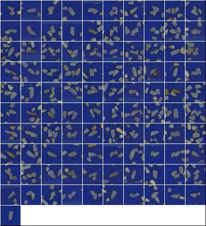 Índices de Qualidade:Peso da Amostra: 100.00 g ( 100.00 %) Discriminação dos defeitos: Inteiros Totais: 4.70 g (4.70 %) Inteiros Perfeitos: 0.50 g (0.50 %) Inteiros Despontados: 4.20 g (4.20 %) Brancura Total 106.69 Brancura Vétrea 104.10 |
