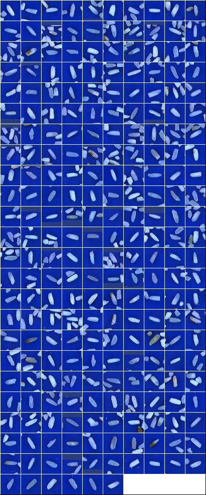 Índices de Qualidade:Peso da Amostra: 100.00 g ( 100.00 %) Discriminação dos defeitos: Inteiros Totais: 12.53 g (12.53 %) Inteiros Perfeitos: 0.00 g (0.00 %) Inteiros Despontados: 12.53 g (12.53 %) Int Desp Vitreo: 6.49 g (6.49 %) Quebrados Vitreos: 41.63 g (41.63 %) Brancura Total 168.00 Brancura Vétrea 152.58 |